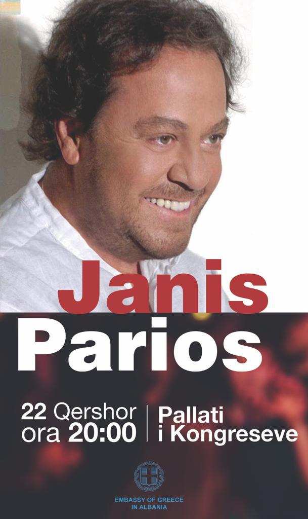 Janis Parios në Tiranë është një ngjarje artistike e përmasave ndërkombëtare që do të rikthejë në Tiranë një nga zërat më unikë të botës së artit grek, këngëtarin me famë botërore Janis Parios. Koncertin e parë në Tiranë e ka dhënë para viteve 90-të dhe tashmë rikthehet si simbol i këngës greke dhe artist i jashtëzakonshëm me një repertor të gjerë dhe që njihet gjerësisht nga publiku shqiptar, kjo e lidhur me zhvillimet shoqerore, sociale dhe kulturore që kanë shoqeruar marrëdheniet mes dy vendeve.